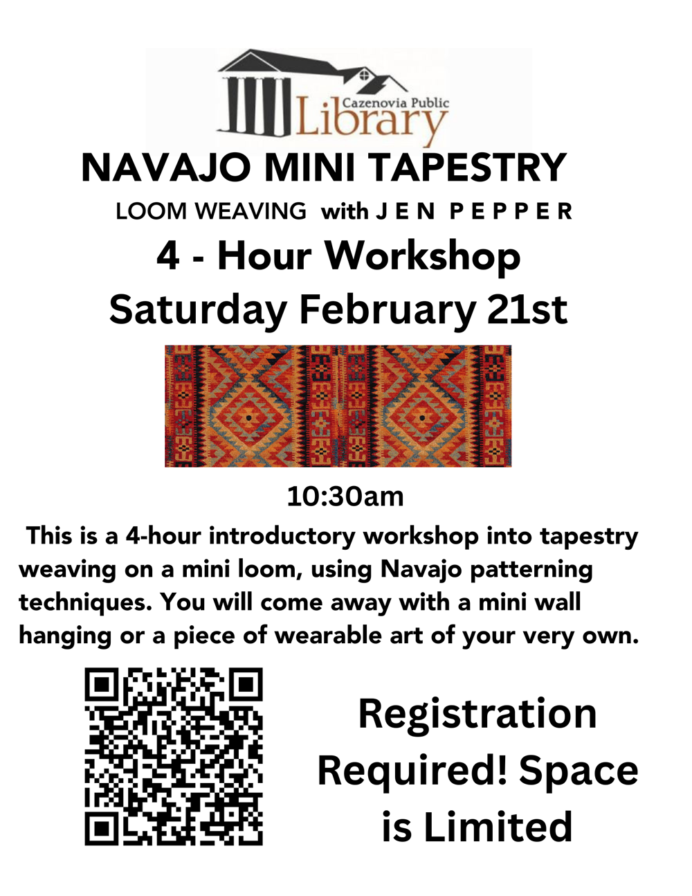 Have you ever been interested in working with yarn to make interesting geometric patterned imagery in fiber? This is a 4-hour introductory workshop into tapestry weaving where you will learn loom warping on a mini loom, followed by basic weaving with diagonal, interlock and dovetail joins, adaptation to other Navajo patterning techniques, finishing techniques and more. You will come away with a mini wall hanging or a piece of wearable art for your very own. Looms and materials will be supplied. There is limited space for this workshop and you must register. This is an adult program. There will be a waiting list, so if you must cancel please do so by February 11th so we can contact people from the waiting list.